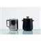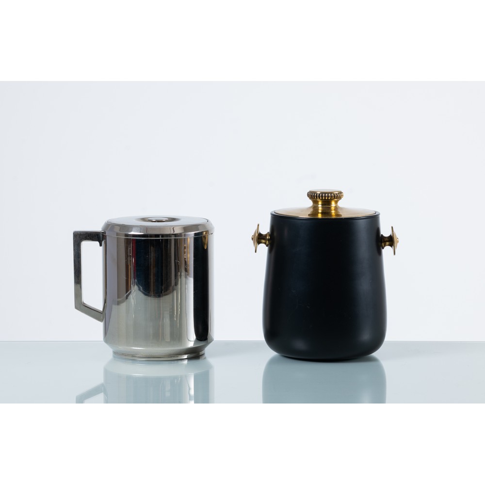 Un cestello portaghiaccio ed una caraffa termica in metallo laccato nero ed ottone e metallo cromato. Marchio di produzione. Segni di uso.