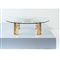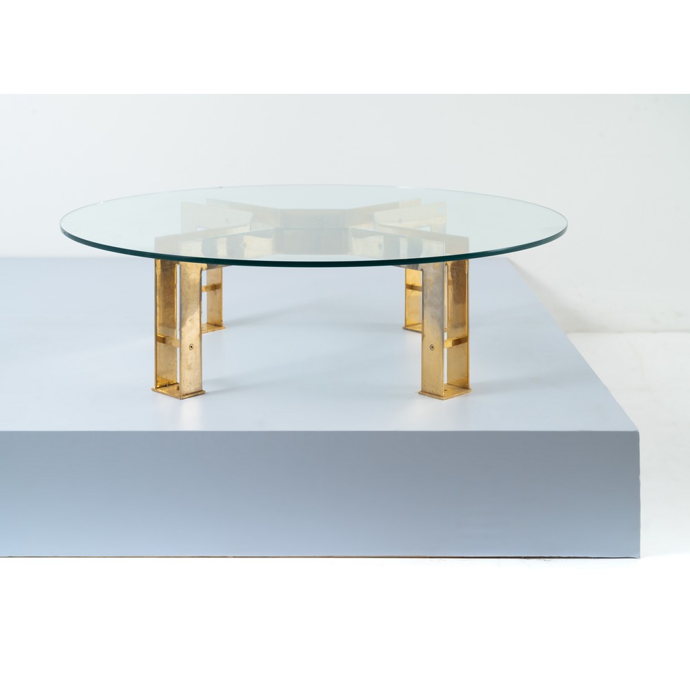 Tavolo da salotto con struttura in ottone lucido, piano circolare in cristallo trasparente.
