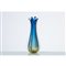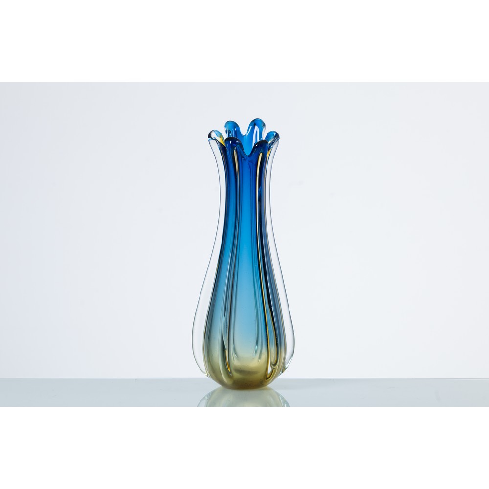Vaso in vetro sommerso incolore, pagliesco e blu, corpo a goccia con costolature verticali, bocca con bordo ondulato, base circolare.