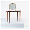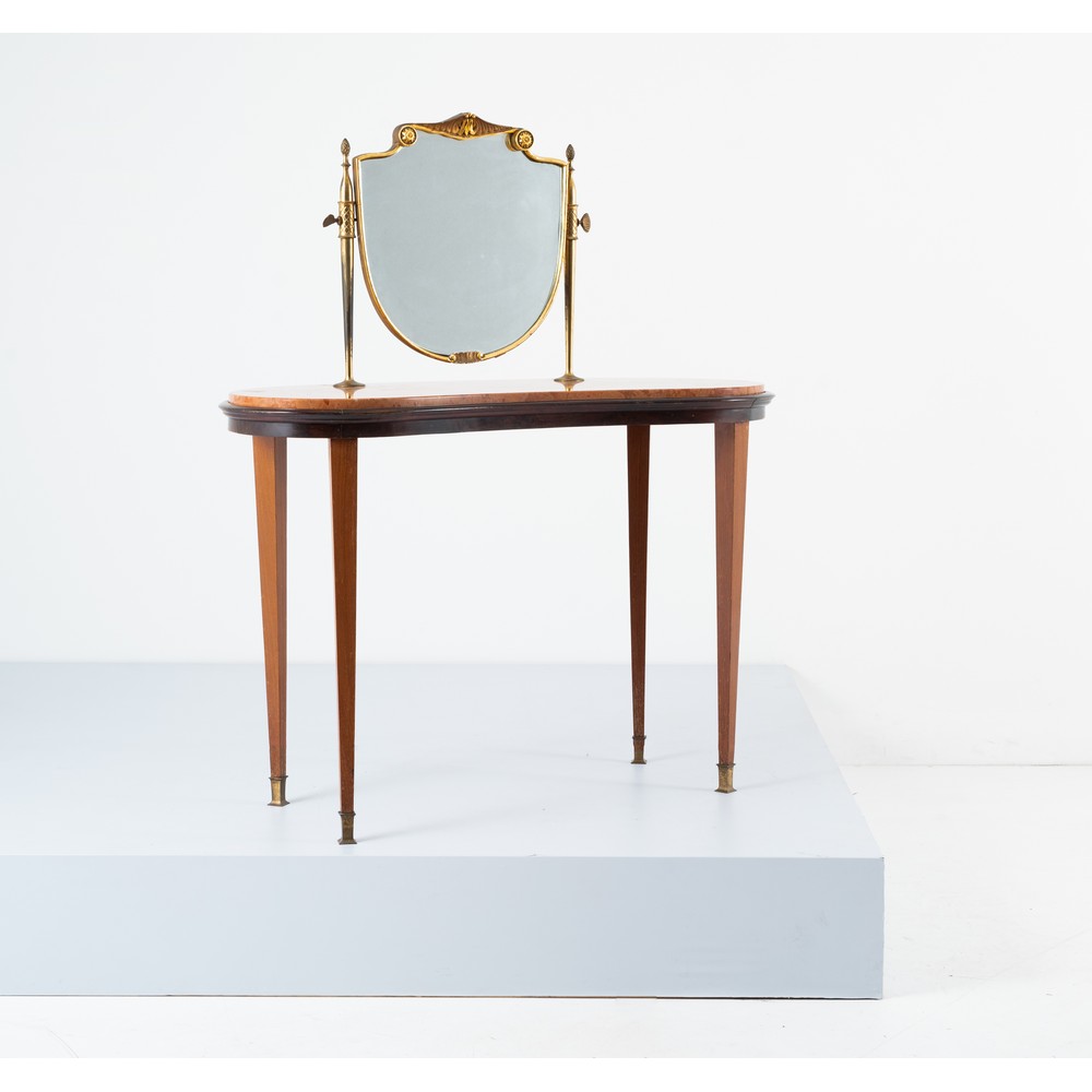Toletta in legno di ciliegio e noce, piano sagomato a fagiolo con marmo rosso di Verona incassato, sul piano uno specchio d’appoggio con cornice basculante sagomata e decorata in ottone, cristallo specchiato, scarpette in ottone. Ossidazioni e lievi graffi.
