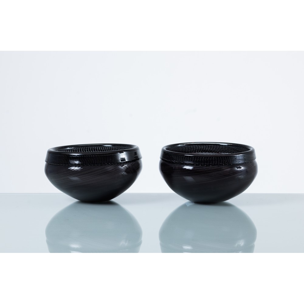 Due coppe semisferiche in vetro “Filigrana” nero seppia, bocca circolare con bordo piano. Firma a graffio e data.