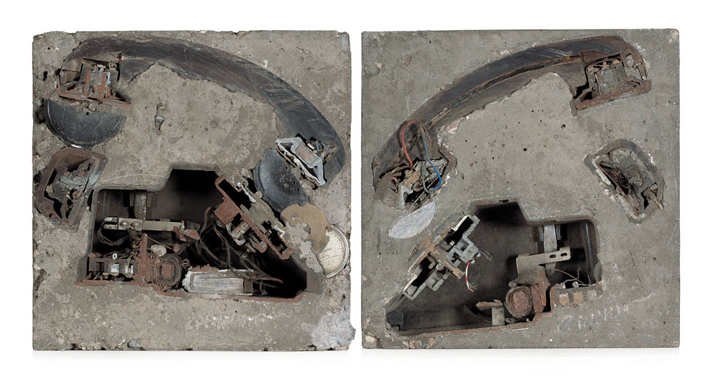 scultura in 2 elementi di cemento e telefoni scomposti cm. 25x25x12,5 cadauno, totale cm. 25x50x12,5; (multiplo originale, tiratura 30 esemplari tutti differenti), entrambi firmati in basso, opera registrata presso l'Arman Archives di New york con il numero APA#8400.74.043 e presso l'Archivio Denyse Durand-Ruel al numero 2219 come da dichiarazione su foto.