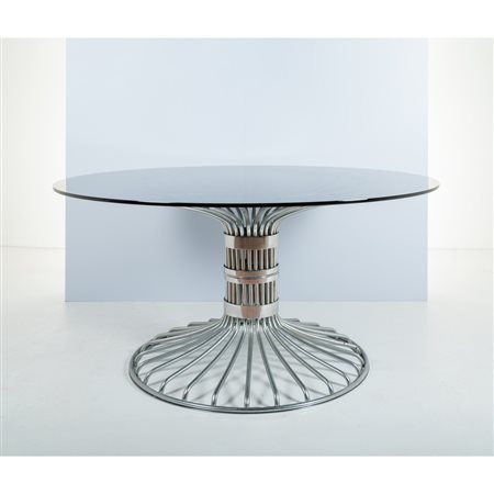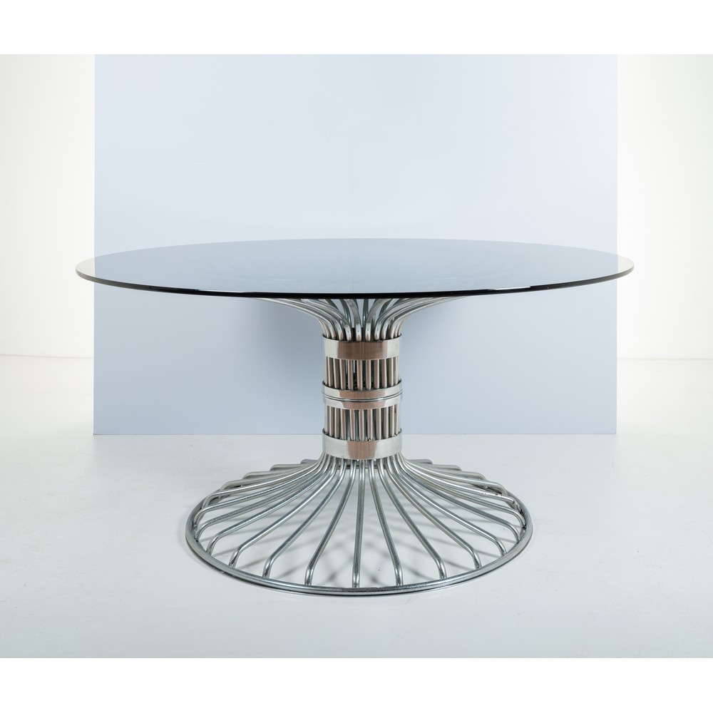 Tavolo da pranzo in tubolare di acciaio cromato e curvato, piano circolare in vetro fumè.