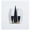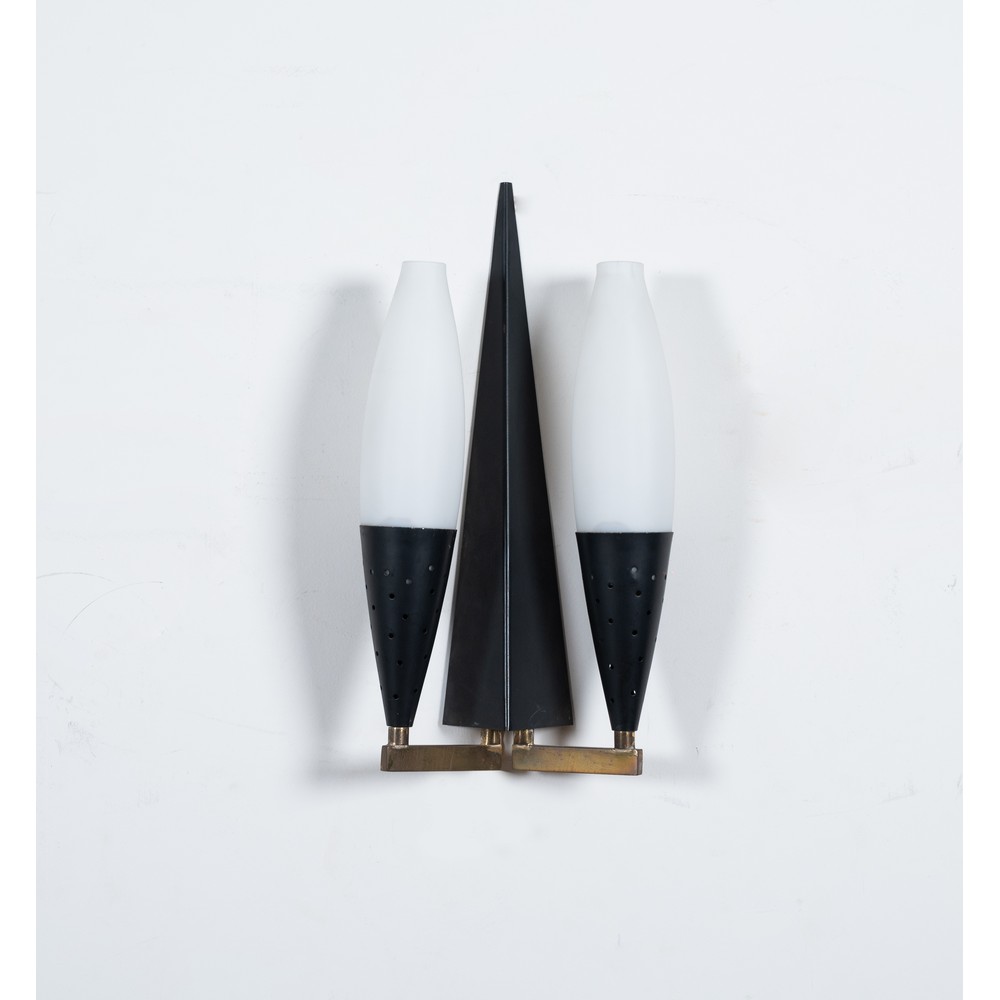 Lampada da parete a due luci con struttura in ottone e metallo verniciato nero, diffusori semiellittici in vetro opalino satinato lattimo, lievi segni d'uso.