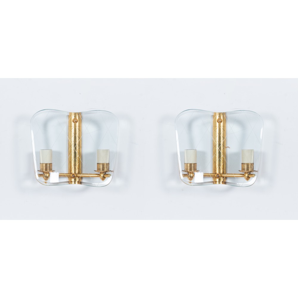 Coppia di lampade da parete a due luci con struttura in ottone, diffusore sagomato e molato in vetro trasparente decorato con rombi incisi.