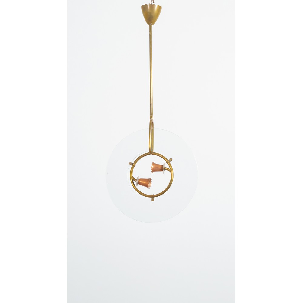 Lampada a sospensione a due luci con struttura in tubolare di ottone, diffusore a disco circolare in cristallo trasparente, portalampada fitomorfo in rame.