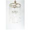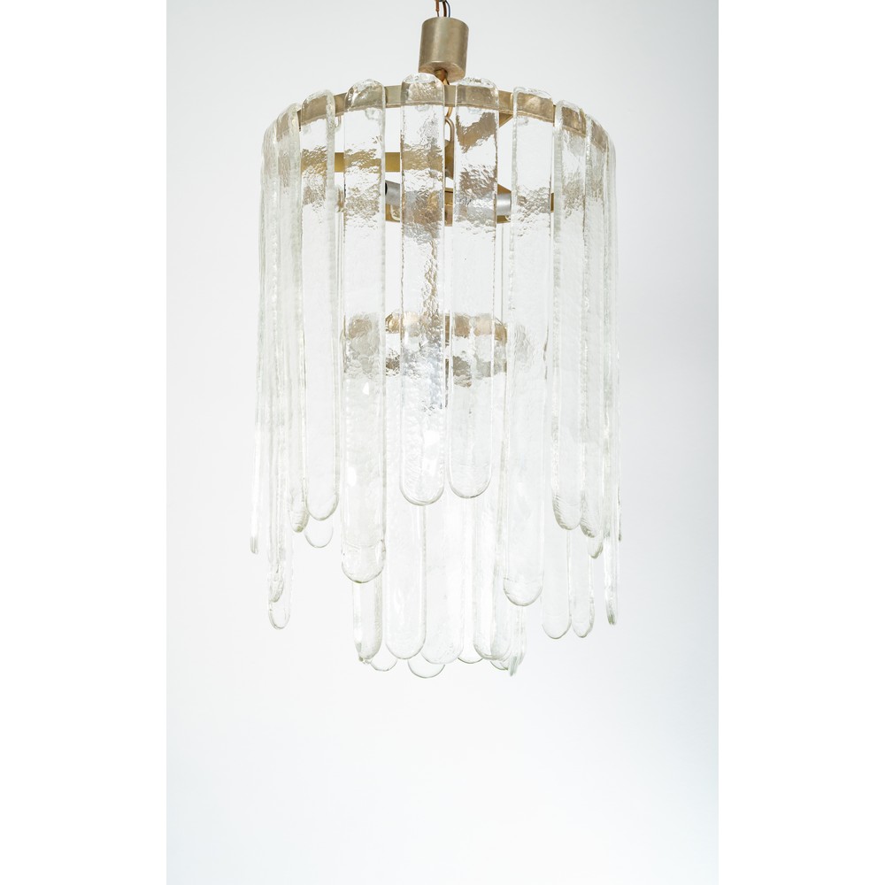 Lampada a sospensione a quattro luci, struttura in metallo nichelato, diffusore a cascata composto da elementi a nastro in vetro trasparente scalpellato e curvato all’estremità superiore.