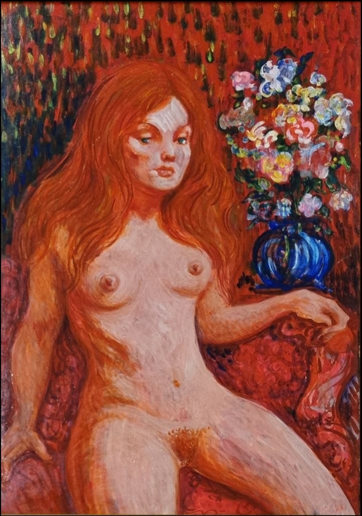 SASSU ALIGI Milano 1912 - Spagna 2000 "Maya con flores" Olio su tela cm 34x48 del 1979. Firmato sul fronte in basso a destra. Al verso firma per autentica e titolo. Autentica dell'Artista su foto.