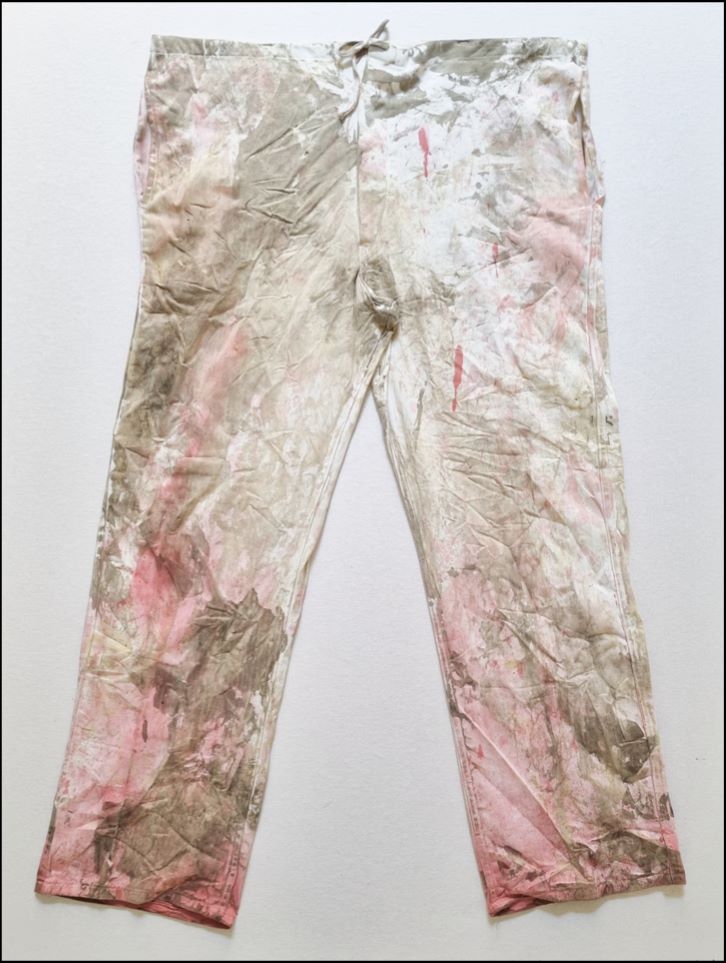 NITSCH HERMANN Vienna 1938 - Austria 2022 "Senza titolo" Tecnica mista su jeans applicato su cartone cm 90x120, del 1982. Sul retro firma, data, galleria di provenienza e timbro di O.M. Theather Hermann Nitsch.