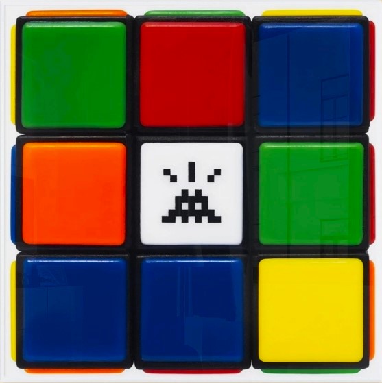 INVADER - FRANCK SLAMA Francia 1969 "Invaded cube" Giclée montato in diasec su pannello di alluminio, cm 100x100 (peso 13,5 kg). Numerato e firmato a mano sull'etichetta. Edizione di 459, certificato di garanzia.