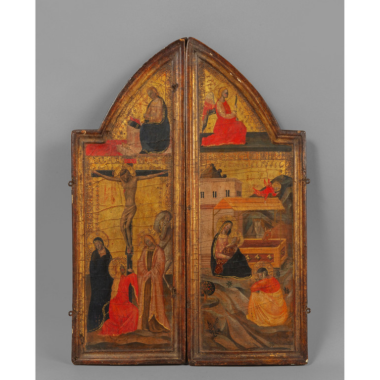 Scuola fiorentina sec.XV 'Crocefissione' e 'Natività con Annunciazione' due tempere su tavola a fondo oro (probabile anta di un trittico portatile)
