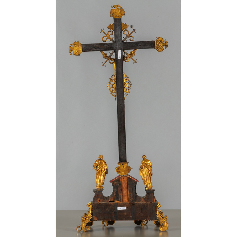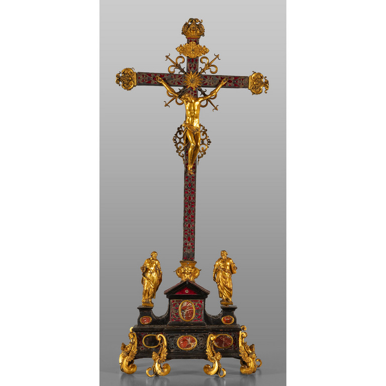 Cristo in croce e figure di evangelisti in bronzo dorato poggiante su piedistallo in legno con applicazioni in pietre dure e lamierine in argento Stato Pontificio sec. XVII