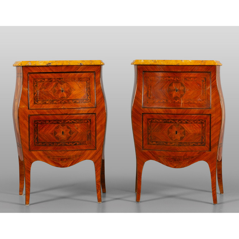 Coppia di comodini a due cassetti movimentati sul fronte e sui fianchi lastronati in legno di rosa e filettati in palissandro con medaglioni ripetuti al centro dei cassetti ed al centro dei due fianchi piani in breccia gialla Napoli I metà sec.XVIII