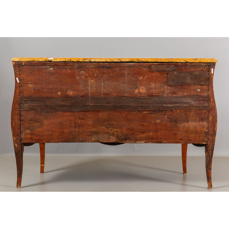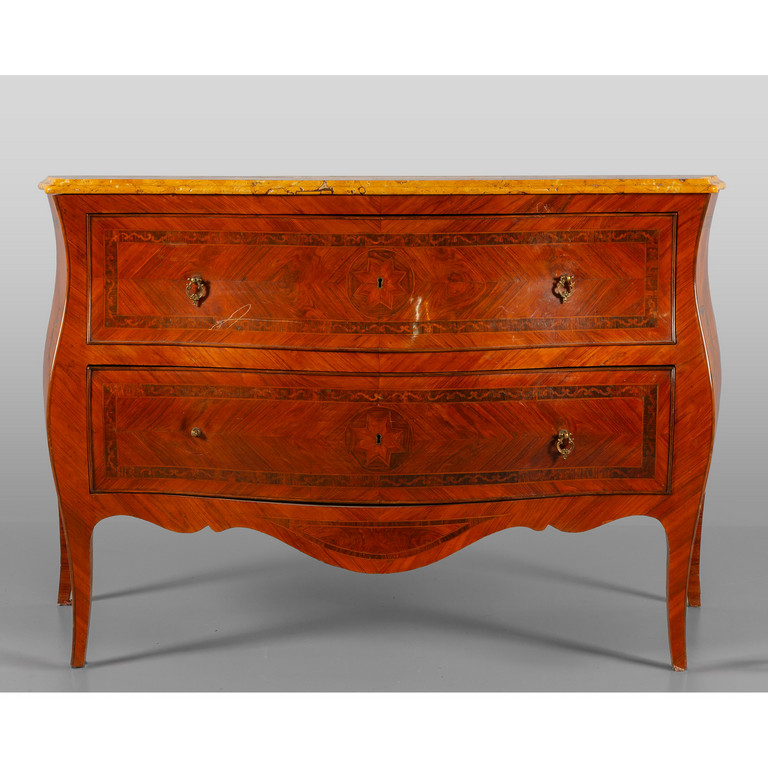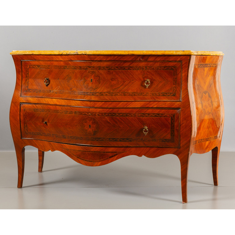 Comò a due cassetti movimentato sul fronte e sui fianchi lastronato in legno di rosa e filettato in palissandro con medaglioni ripetuti al centro dei cassetti ed al centro dei due fianchi piano in breccia gialla Napoli I metà sec.XVIII