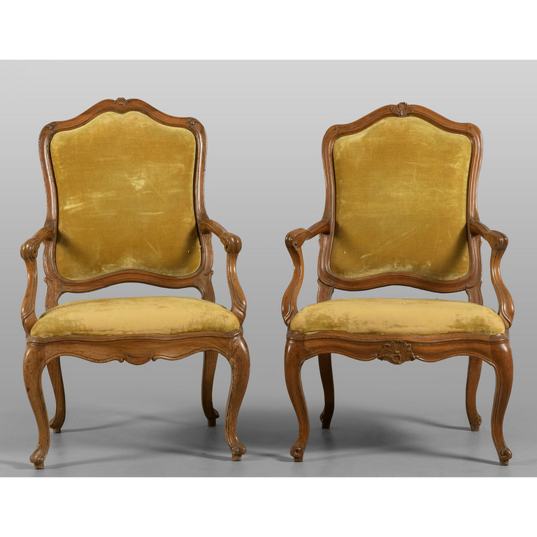 Coppia di poltrone Luigi XV in noce schienale e fascia frontale intagliati Genova sec.XVIII