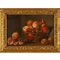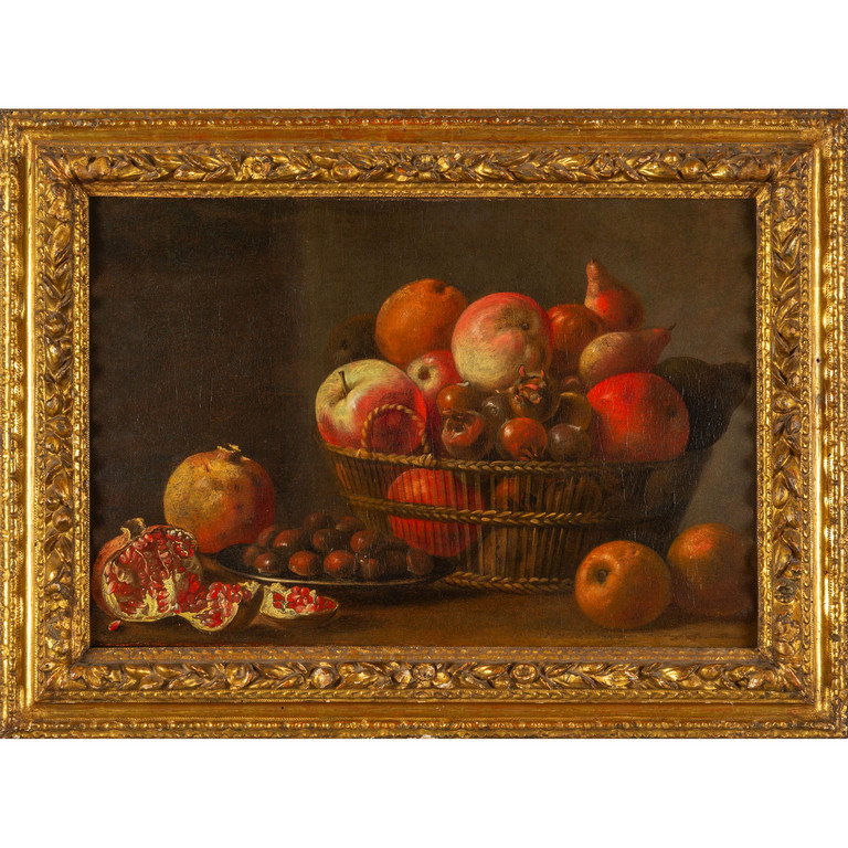 Scuola romana sec.XVII 'Melograni e frutta' olio cornice coeva in legno intagliato e dorato
