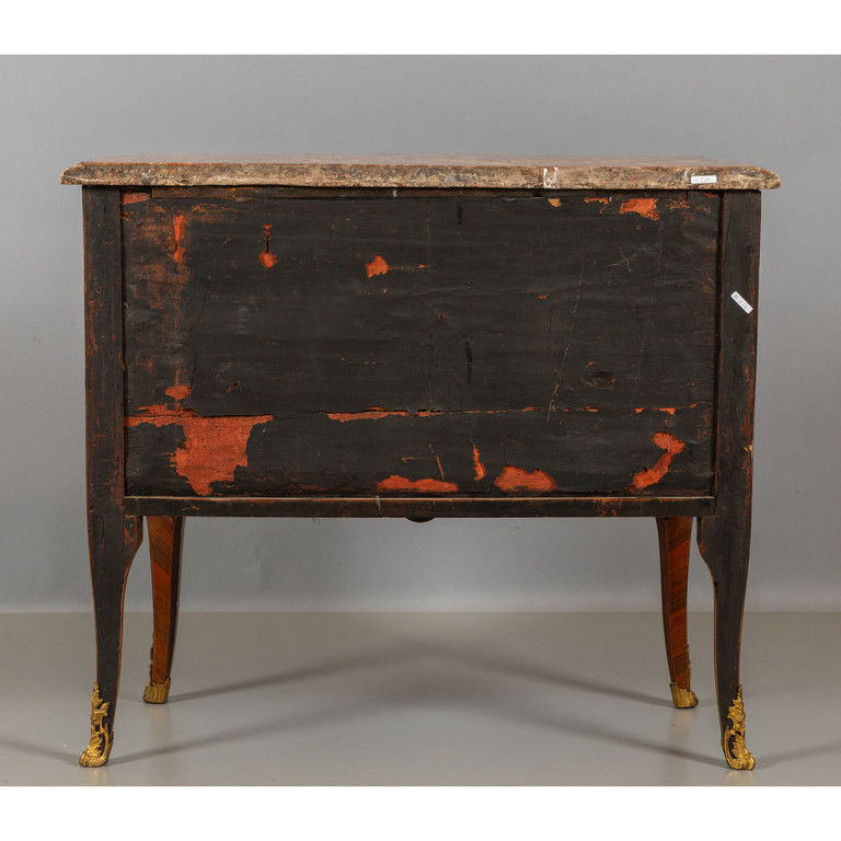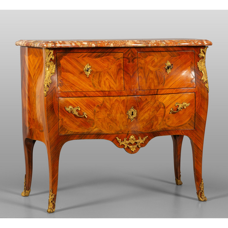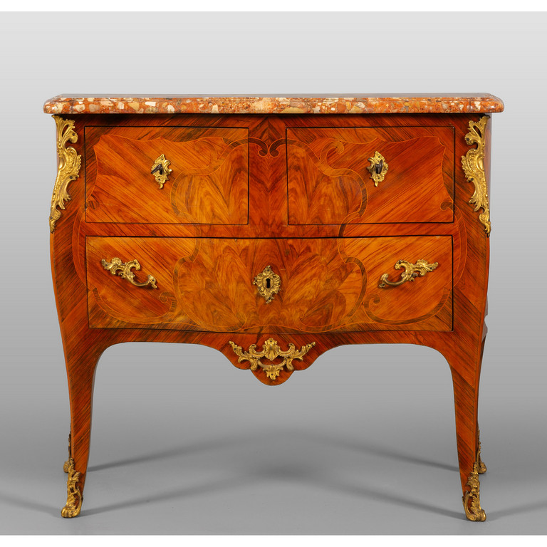 Comò Luigi XV ad un cassetto più due lastronato in palissandro ed intarsiato in bois de rose ricca applicazione di bronzi piano in breccia Francia sec.XVIII