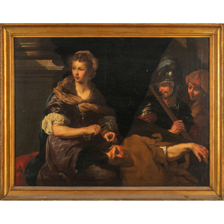 Scuola lombarda sec.XVII 'Sansone e Dalila' olio cornice coeva