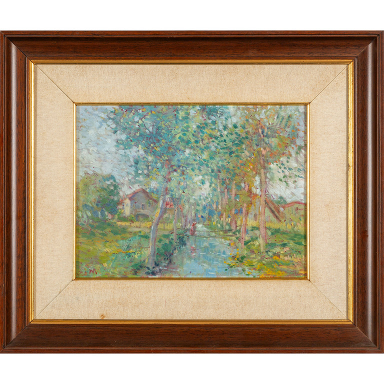Casolare con fiume ponticello e personaggio