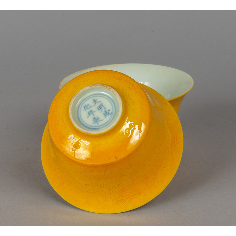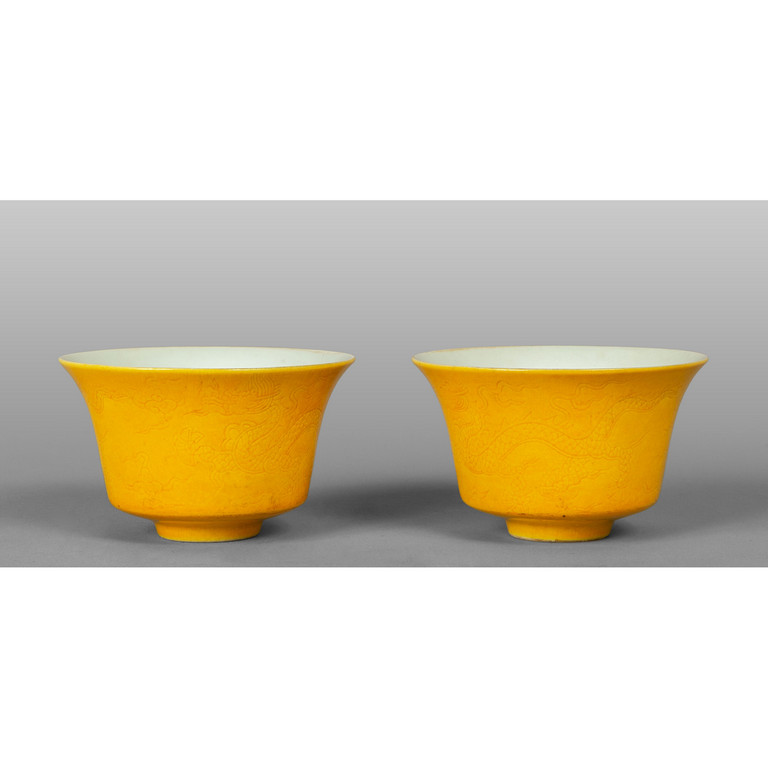 Coppia di tazze in porcellana bianca e gialla decorate ad incisione con figure di draghi marcate alla base Cina sec.XVIII