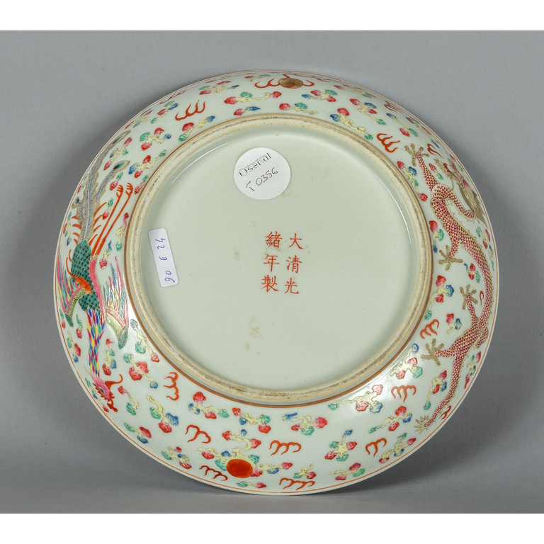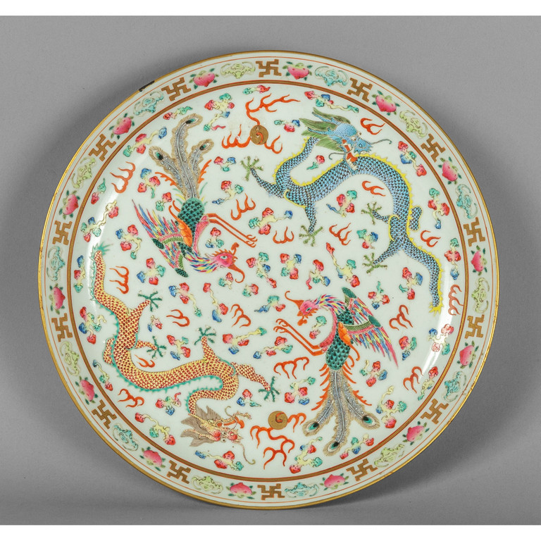 Piatto in porcellana policroma decorato con dragoni e fenice marcato alla base Cina sec.XIX