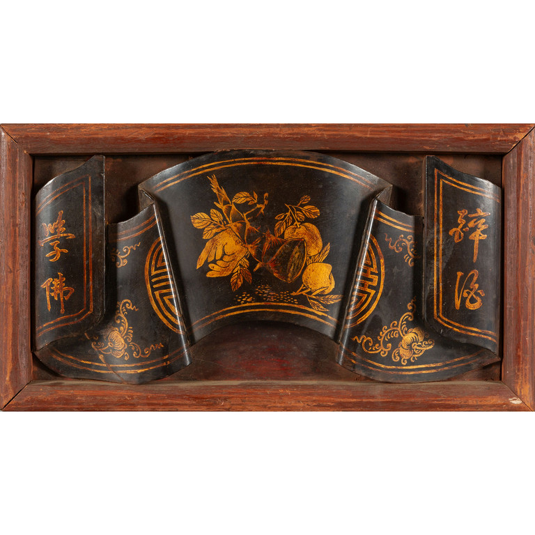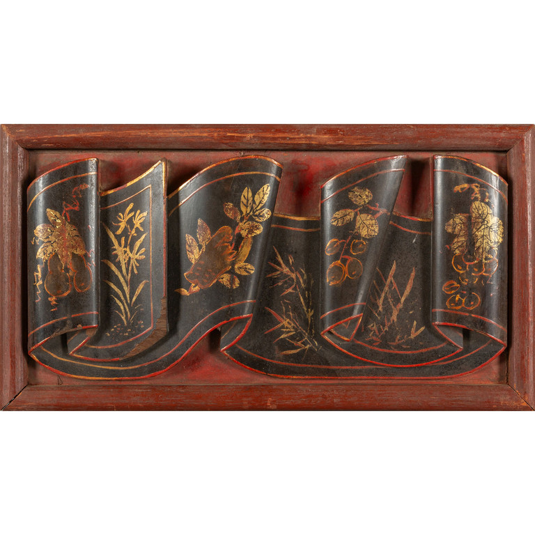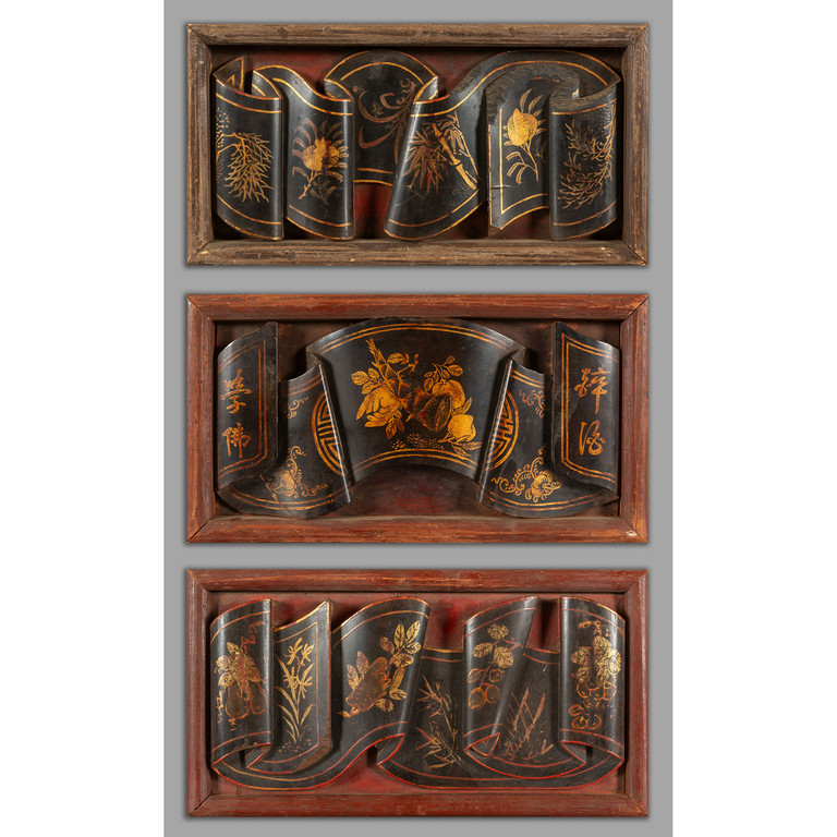 Tre pannelli in legno intagliato e laccato a fondo nero con fiori Giappone sec.XIX