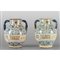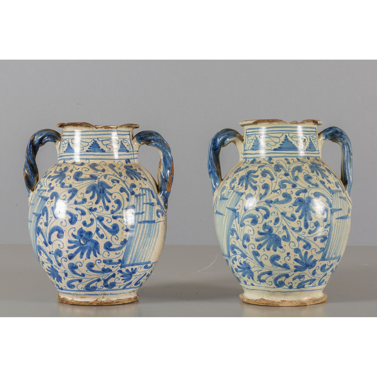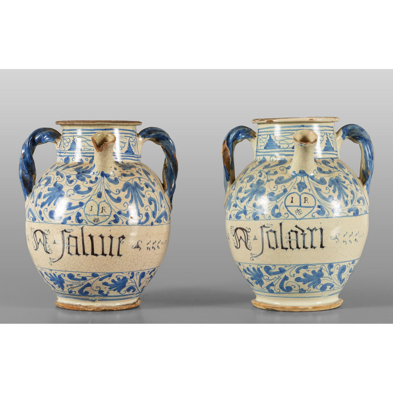 Coppia di orci da farmacia in ceramica con manici biansati e beccuccio versatoio decorati a fiori geometrici in blu su fondo bianco con scritte medicinali Montelupo sec.XVIII