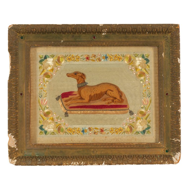 Levriero ricamo a punto spugna e punto pittura entro la sua teca sec.XIX