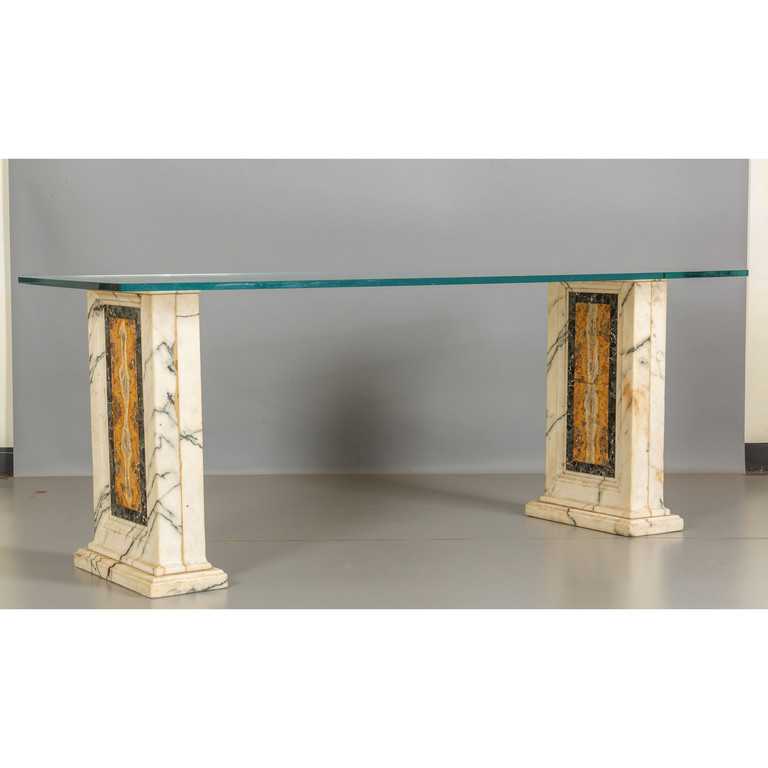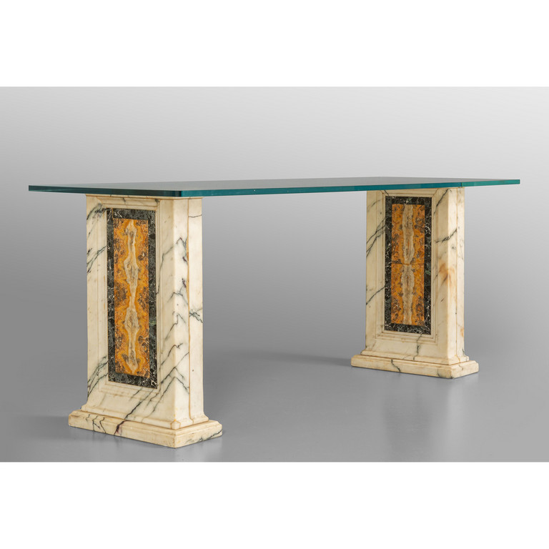 Tavolo composto da coppia di lesene Luigi XIV in marmo con piano in vetro