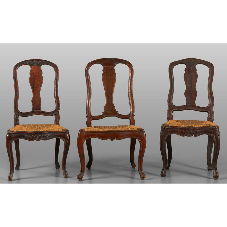 Tre sedie Luigi XV in noce con schienale a stecca intagliato Genova I metà sec.XVIII