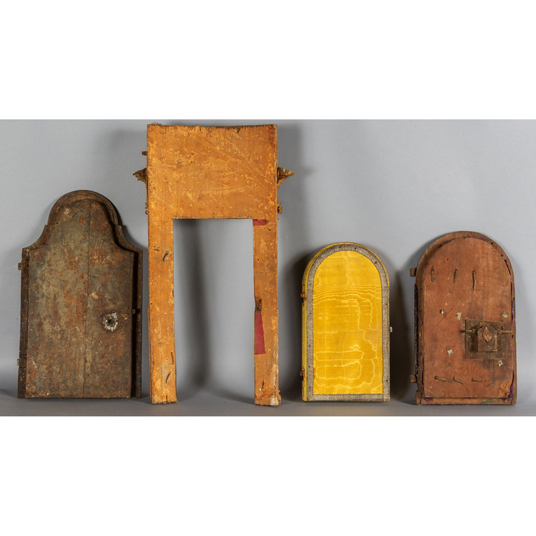 Due sportelli in ferro uno in legno intagliato e dorato ed una cornice a tabernacolo in legno intagliato e dorato del sec.XVIII
