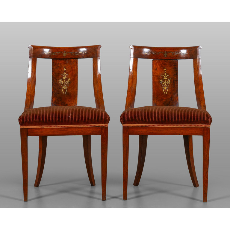 Coppia di sedie Impero a gondola in mogano con applicazioni in ottone I metà sec.XIX