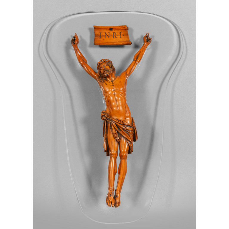 Cristo crocefisso scultura in bosso (pezzo unico) sec.XIX poggiante su base in plexiglass