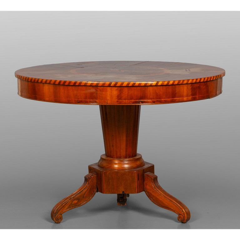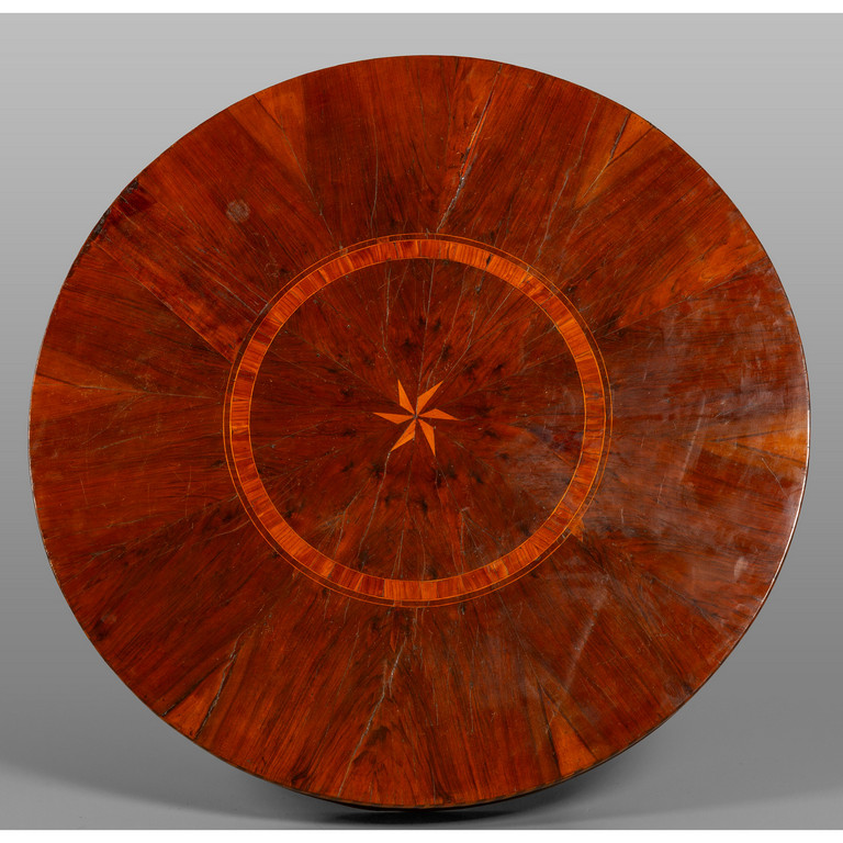 Tavolo Carlo X di forma rotonda lastronato in palissandro ed intarsiato con stella sul piano Genova sec.XIX