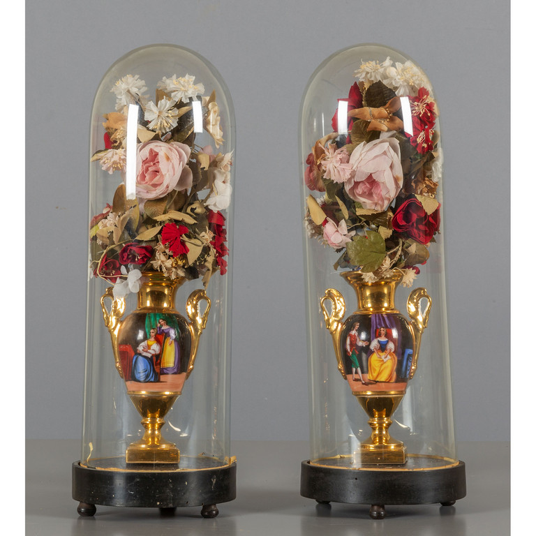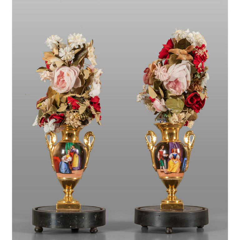 Coppia di vasi pompeiani in porcellana decorati con scene romantiche campane di epoca in vetro sec.XIX