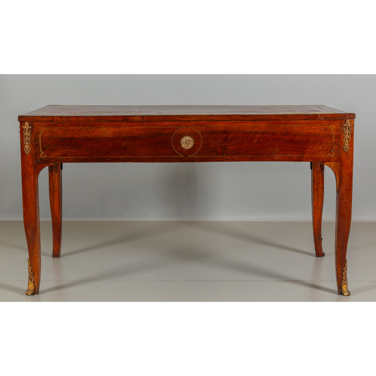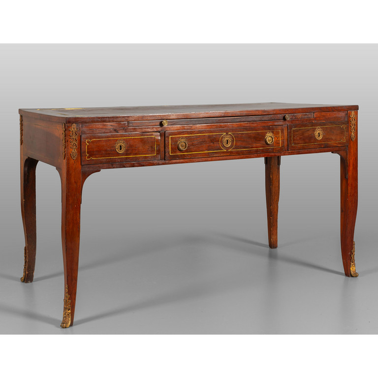 Scrivania Direttorio da centro lastronata in palissandro con ricca decorazione in bronzo dorato sul fronte un cassetto grande e due piccoli pianetto estraibile Francia I metà sec.XIX con poltrona e sedia analoghe
