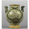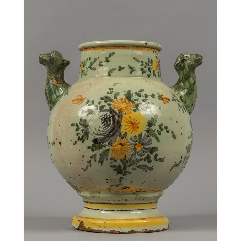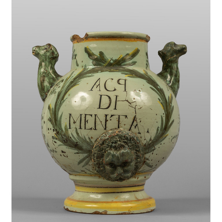 Idria in ceramica decorata in policromia su fondo berrettino presa a forma di animale scritta 'Aqua di menta' Savona sec.XVIII
