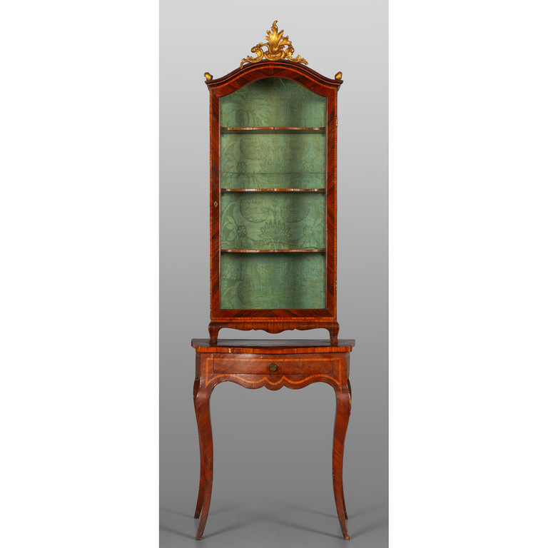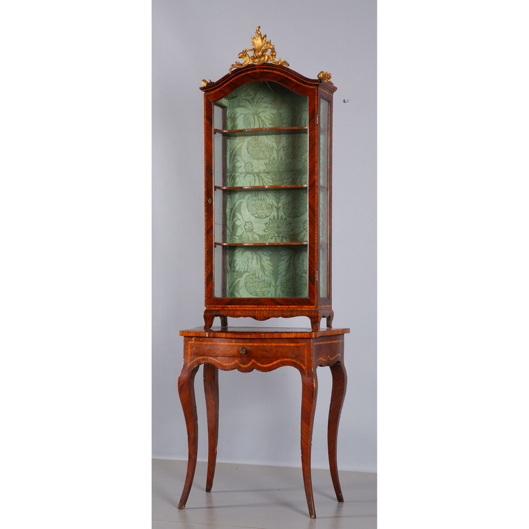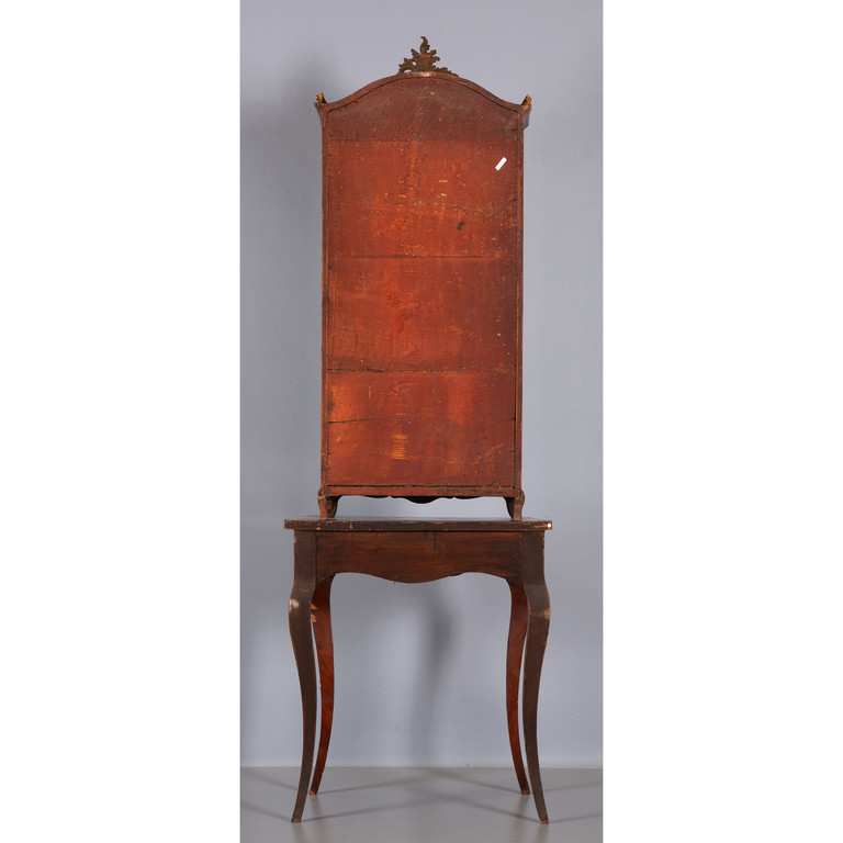Vetrinetta Luigi XV lastronata in palissandro e filettata in bois de rose cimasina e laterali in legno intagliato e dorato Genova I metà sec.XVIII (cm. 53x24 5 h.125) poggiante su consolina in stile movimentata sul fronte e sui fianchi con cassetto nella fascia (cm.66x44xh.74)