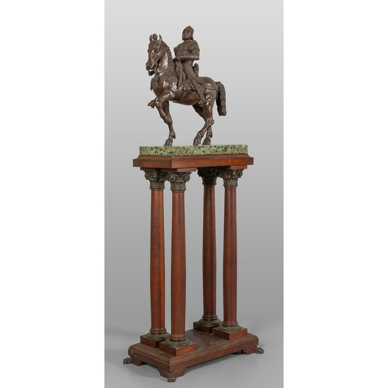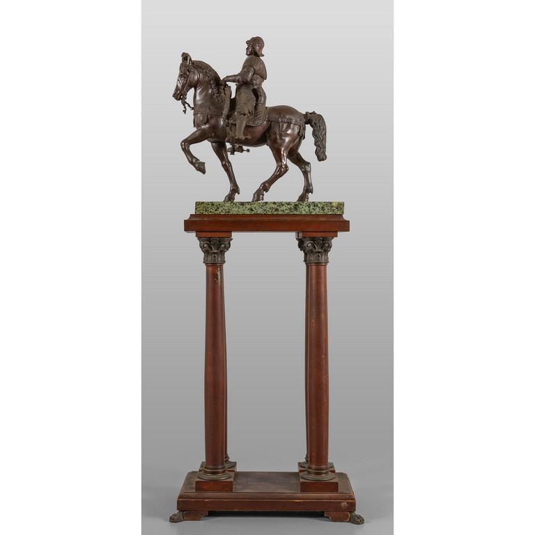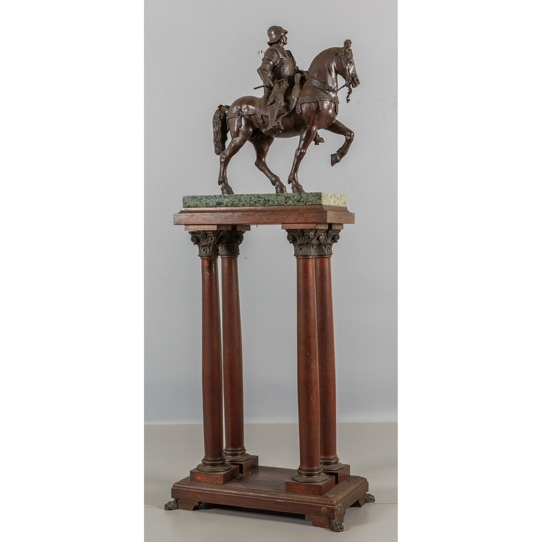 Monumento equestre di Bartolomeo Colleoni dal modello di Andrea da Verocchio scultura in bronzo poggiante su base in marmo sorretta da colonne lignee fine sec.XIX