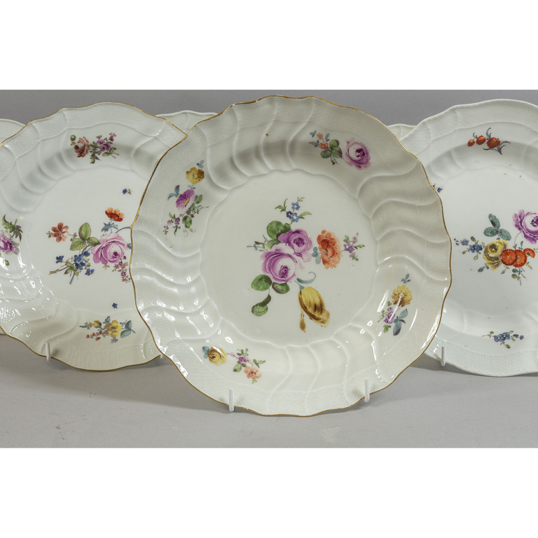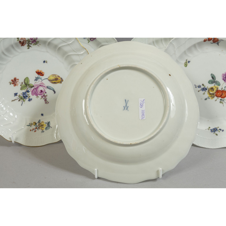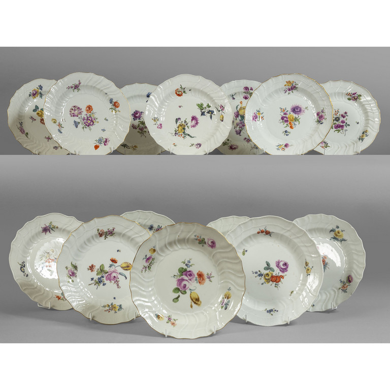 Quattordici piatti in porcellana di Meissen decorati in policromia a fiori su fondo bianco sec.XIX