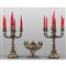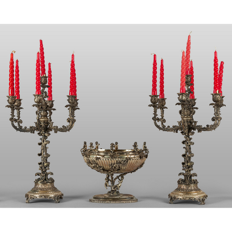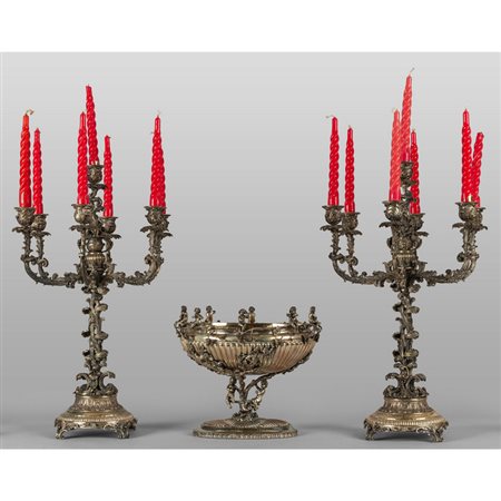 Trittico composto da centrotavola in argento riccamente sbalzato con putti e coppia di candelabri a sette luci in argento