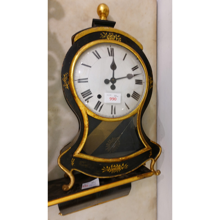 Cassa di orologio in legno laccato nero ed oro con mensola