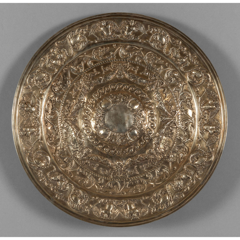 Grande piatto Luigi XVI di forma rotonda finemente sbalzato con figure allegoriche e serti Roma inizi sec.XIX