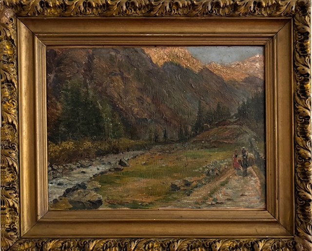Ettore Mazzini Genova 1891 - 1960 La valle del Lys a Gressoney, Olio su cartone cm 25x35 firmato in basso a sx datato 1922