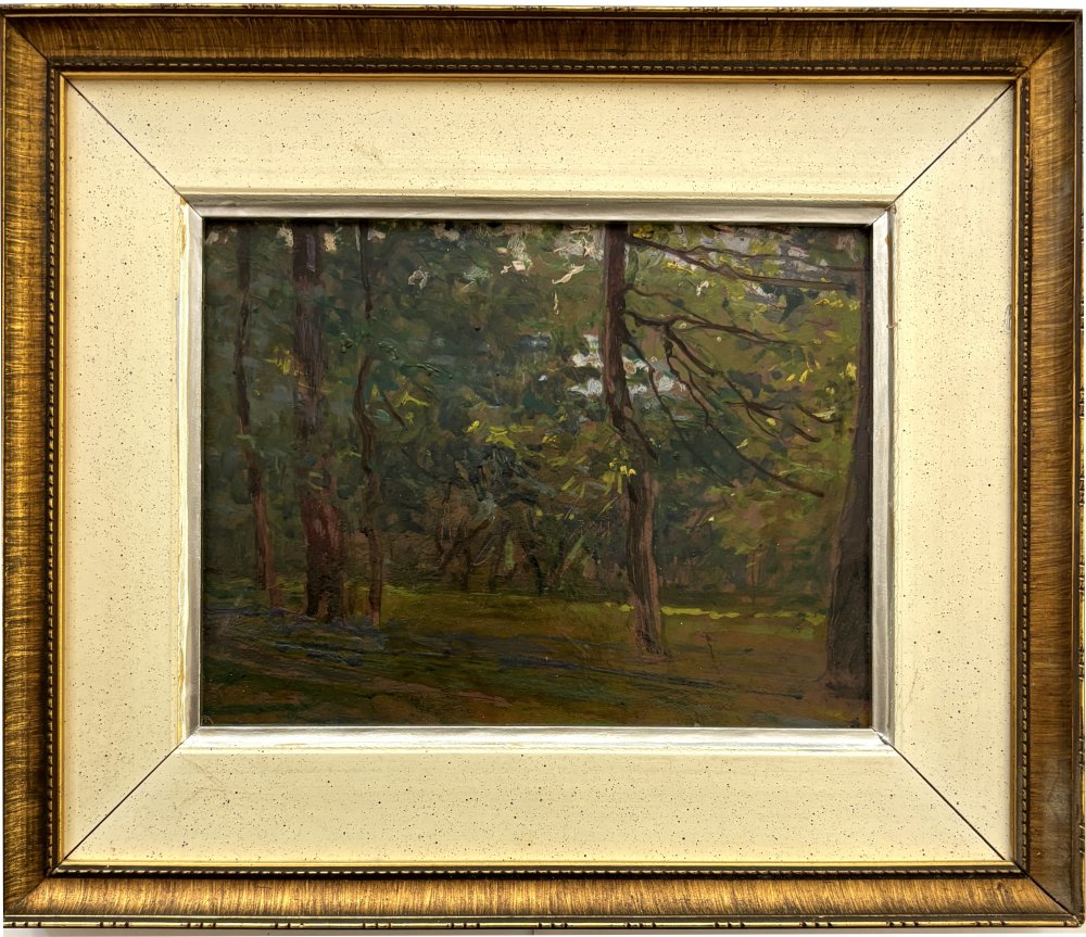 Decoroso Bonifanti Chiavari (GE) 1861 - 1941, Paesaggio Boschivo, Olio su cartone cm 11x16 non firmato, iscrizione al retro