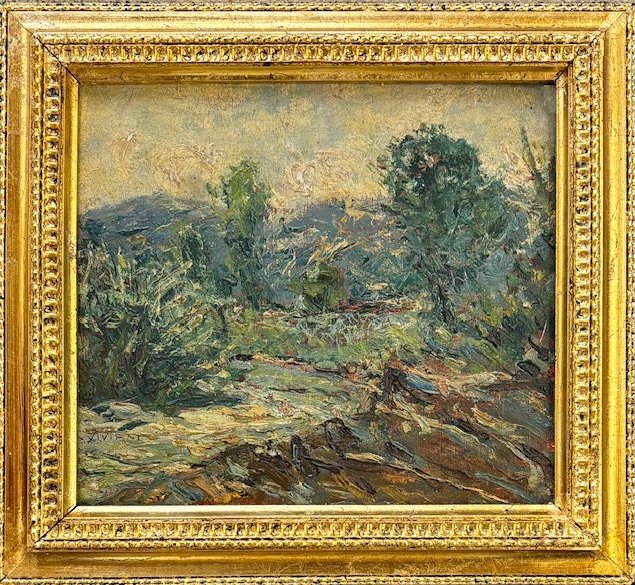 Raoul Viviani Firenze 1865 - 1965 Rapallo, Paesaggio Boschivo, Olio su tavola cm 25x30,5 firmato in basso a sx