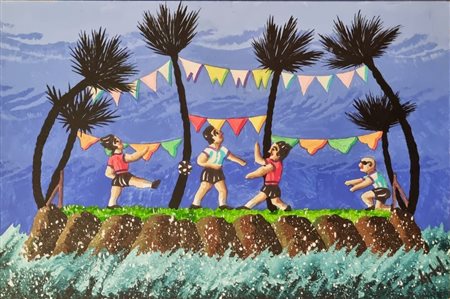 APHEL FABIO Cavalese (TN) 1957 "Il gioco del calcio" Olio su tavola cm 30x20. Firmato sul fronte in basso a destra. Al verso firma, titolo e misure.