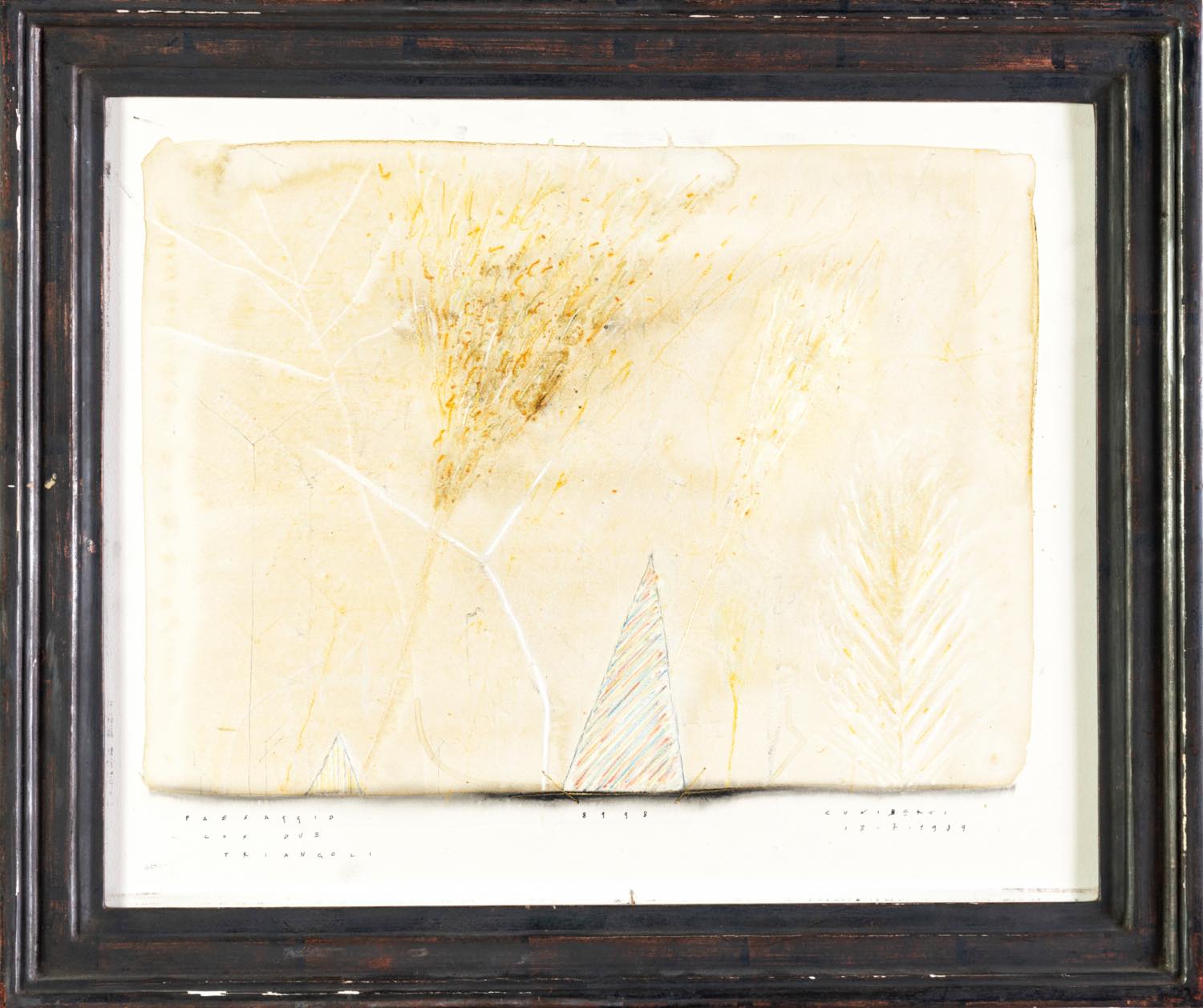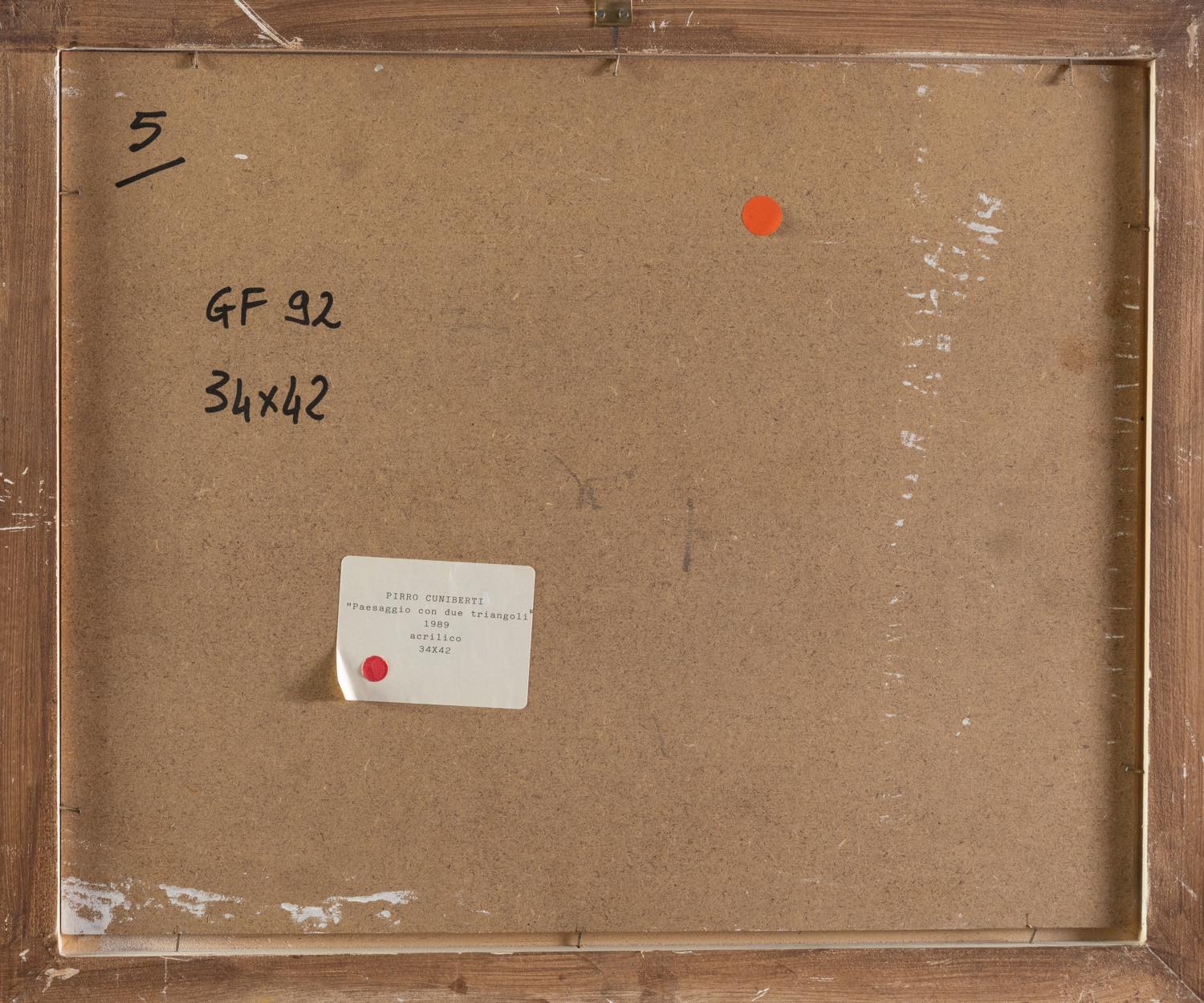 Pirro Cuniberti (Sala Bolognese 1923 – Bologna 2016), “Paesaggio con due triangoli”, 1989. - Acrilico su cartone pressato, firmato e datato in basso a destra, reca titolo in basso a sinistra e in basso al centro cifre “8998”, presenta al retro etichetta, H cm 34x42