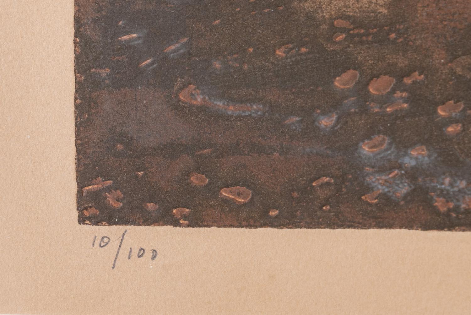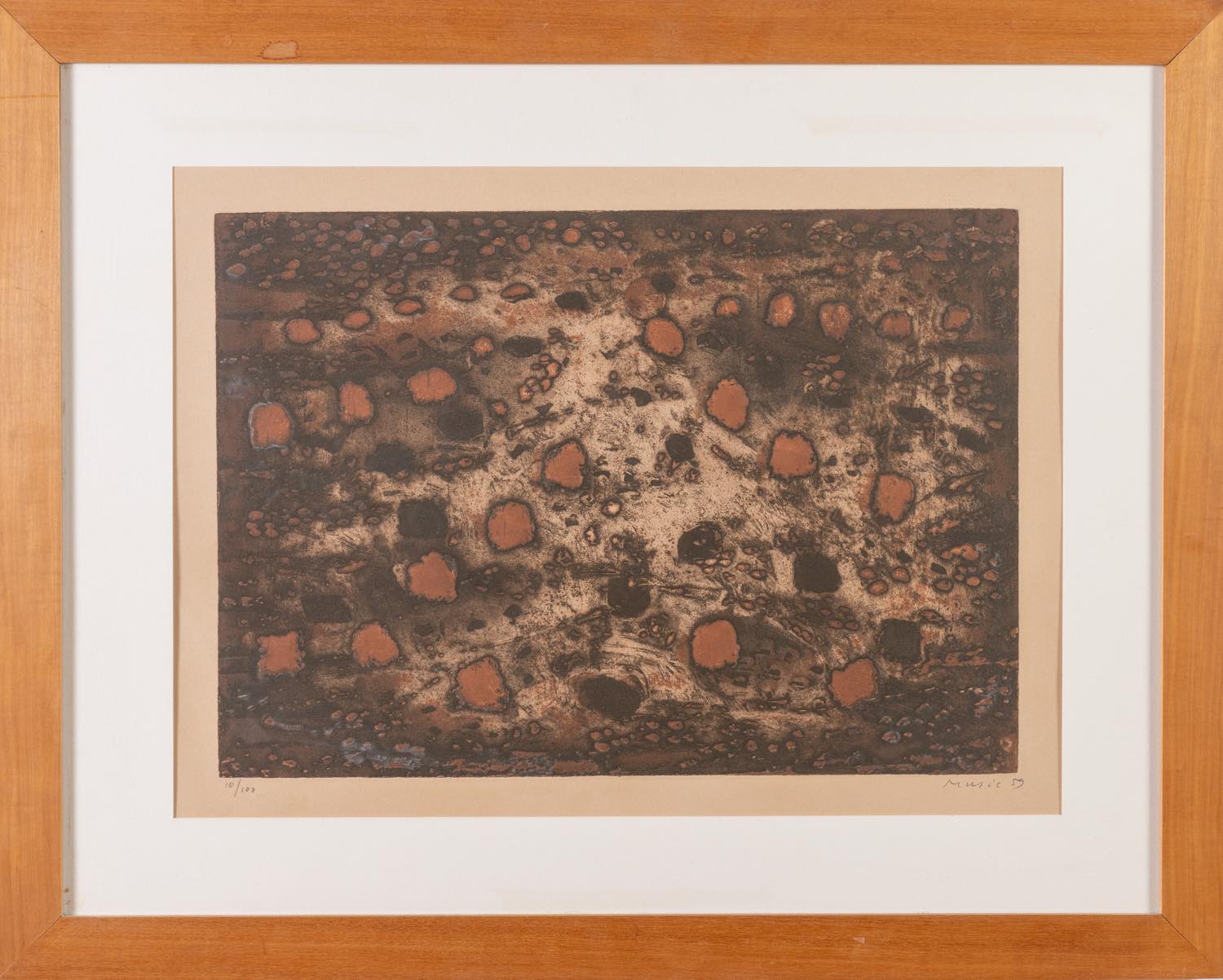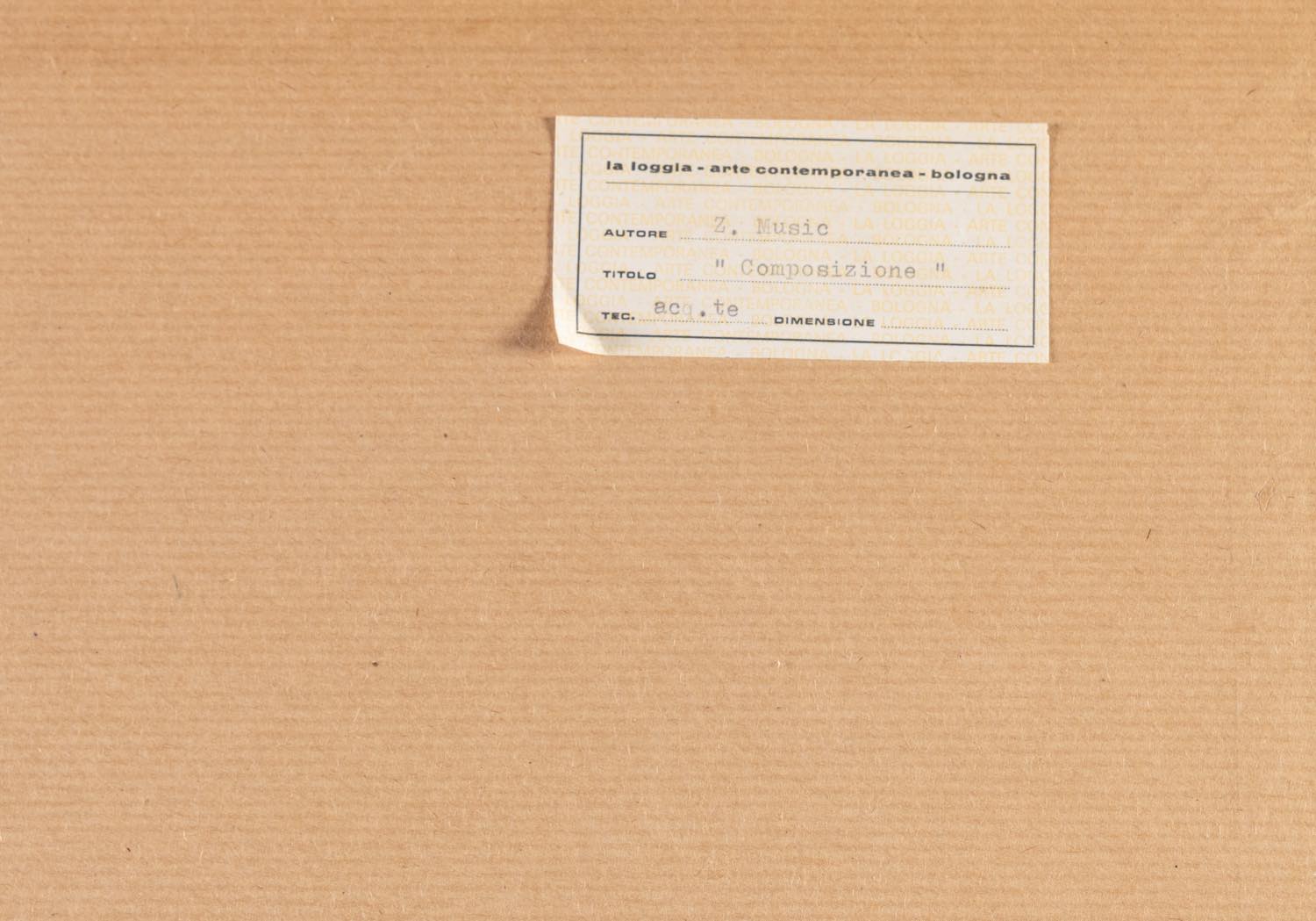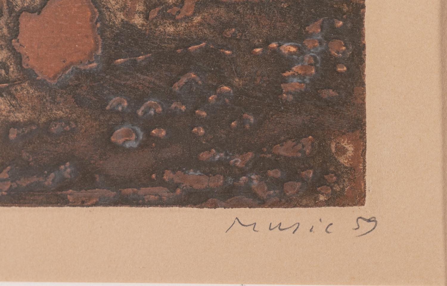 Anton Zoran Music (Boccavizza 1909 – Venezia 2005), “Terres Dalmates”, 1959. - Acquaforte acquatinta a colori su carta, firmata e datata in basso a destra, numero di tiratura in basso a sinistra 10/100, reca al retro etichetta della Galleria La Loggia - Bologna, Lastra H cm 37x53, con cornice H cm 66x82