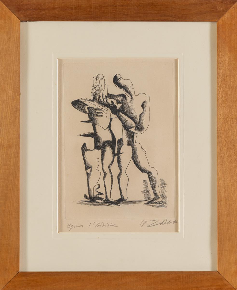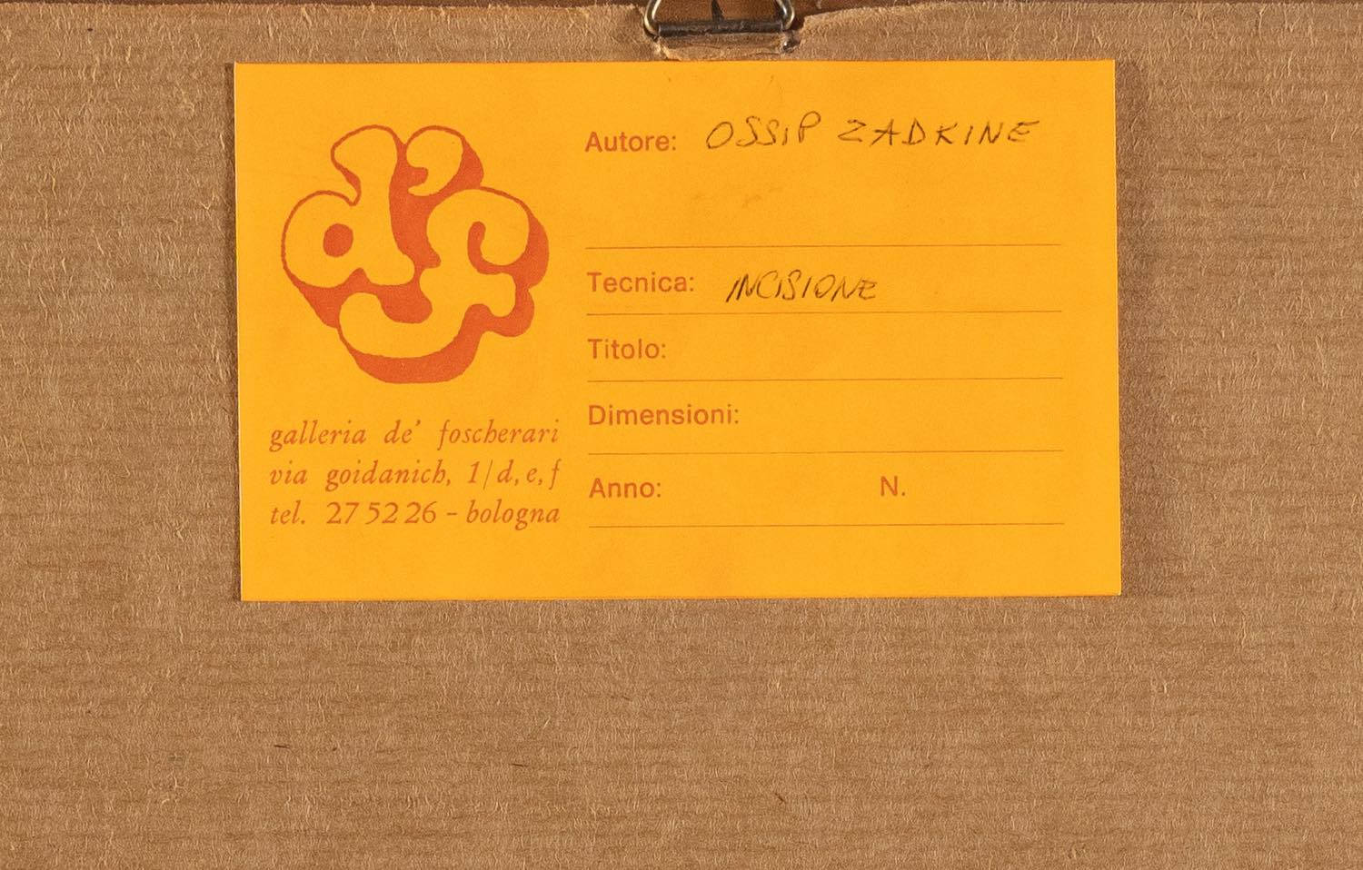 Ossip Zadkine (Smolensk 1890 - Parigi 1967), “Hauteurs inimaginables ou l’homme combat” da “Sept Calligrammes d’Apollinaire”, 1967. - Incisione su carta, firmata in basso a destra, esemplare in basso a sinistra epreuve d’artiste, reca al retro etichetta della Galleria De Foscherari - Bologna con autore e tecnica, Lastra H cm 30x21
